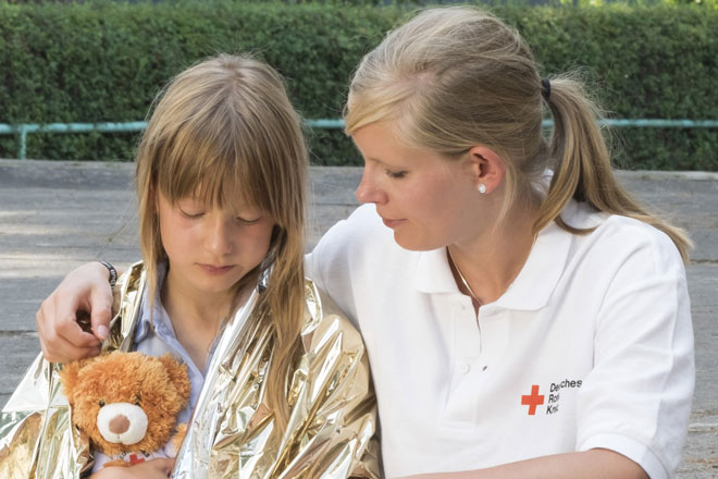 - Bis zum Eintreffen des Rettungsdienstes beruhigen, betreuen, trösten und beobachten, wiederholt Bewusstsein und Atmung prüfen